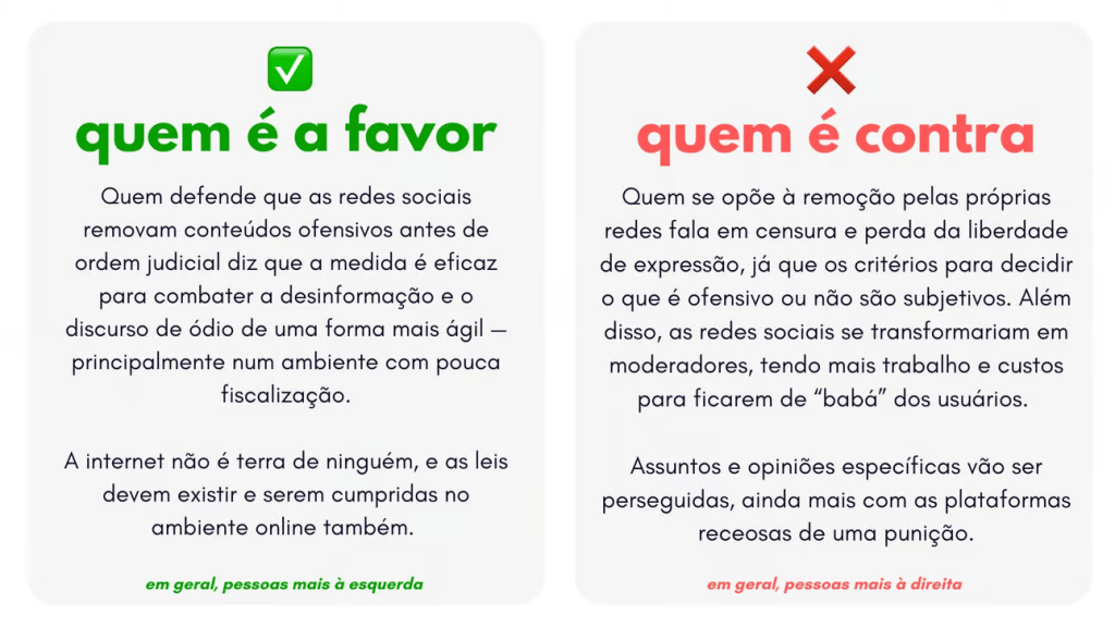 No fim da linha, o STF vai mexer tanto com os direitos dos usuários quanto as responsabilidades das redes sociais. Muita discussão já está rolando sobre, tolerância a crimes, censura e liberdade de expressão.