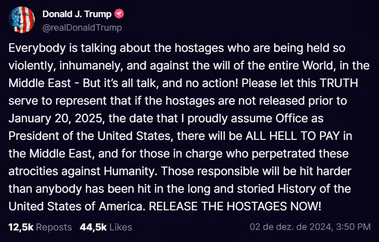🇺🇸 “LIBERTE OS REFÉNS AGORA!” Trump prometeu que vai infernizar a vida do Hamas se o grupo palestino não libertar, até a posse dele, os reféns israelenses sequestrados no 07 de outubro de 2023. “Os responsáveis serão atingidos mais do que qualquer um foi atingido na longa e histórica História dos EUA”