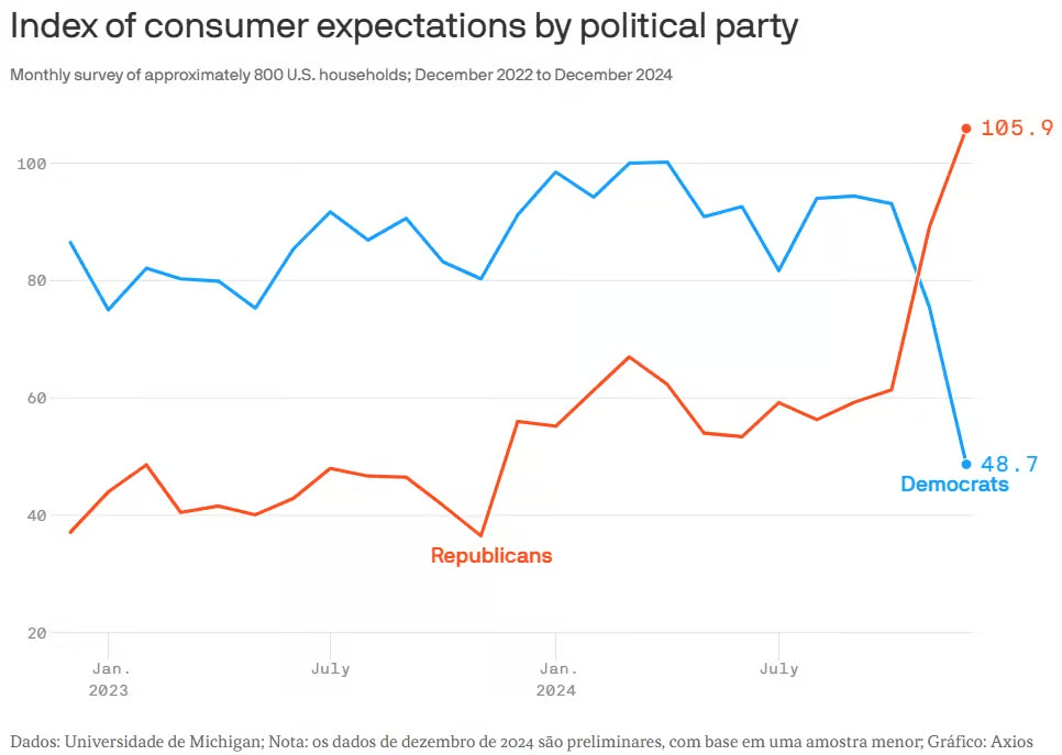 - 🫏 Enquanto isso, o sentimento dos democratas caiu de 91,4 em outubro para 70,9 em dezembro.