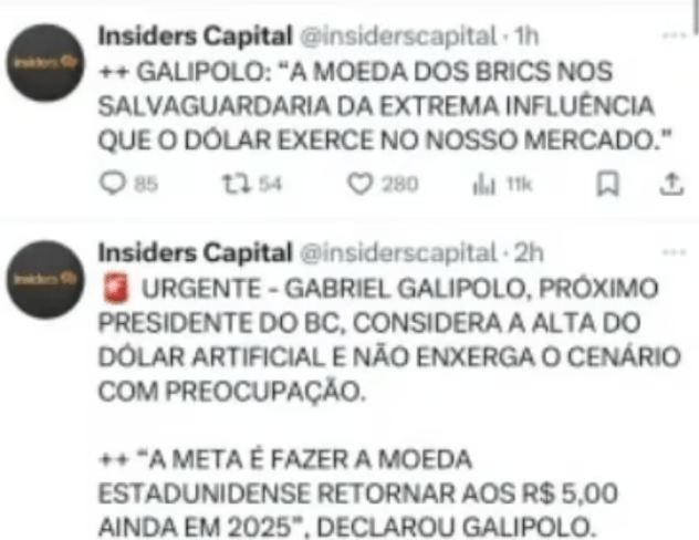 Vou explicar: A página, anônima, criada em agosto e com apenas 3.5k seguidores, disparou frases, assinadas por Galípolo, “a alta do dólar é artificial“ e “o BC quer o dólar a R$ 5 em 2025” — mas nenhuma delas foi dita por ele.