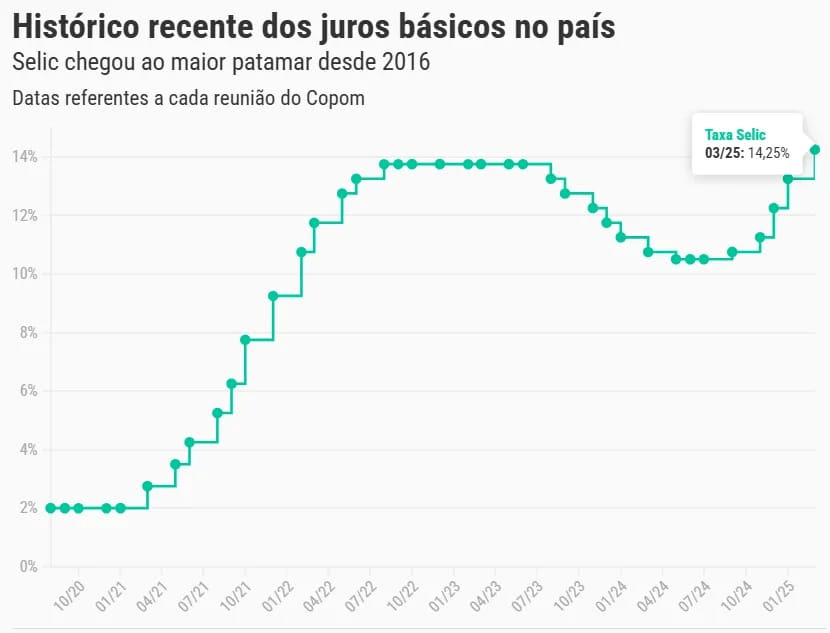 O Comitê de Política Monetária do Banco Central (Copom) subiu pela 5ª vez consecutiva a taxa Selic, de 13,25% para 14,25% — a colocando no maior patamar desde 2016.
