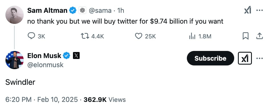 Do outro lado, Altman não deixou a postura ousada de Musk barata e ironicamente tweetou dizendo: “não obrigado, mas a gente vai comprar o Twitter por US$ 9.74 bilhões se você quiser”. Musk só respondeu com um “vigarista”.