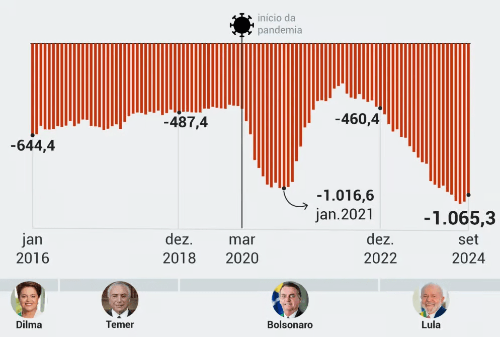 Pelo 6º mês seguido, o Brasil teve um déficit nominal maior que R$ 1 trilhão . Embora o rombo tenha diminuído de um mês para o outro, faz pelo menos meio ano que o país gasta muito mais do que arrecadação de impostos.