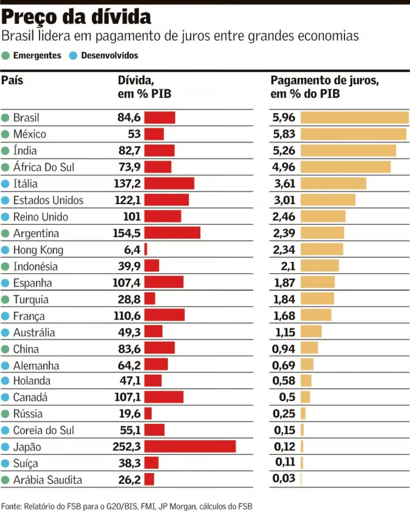 Estamos no topo do pódio… Mas de um pódio não é tão agradável assim. O Brasil é o país que mais paga juros de dívida no mundo, com uma taxa de 5,96% do PIB.