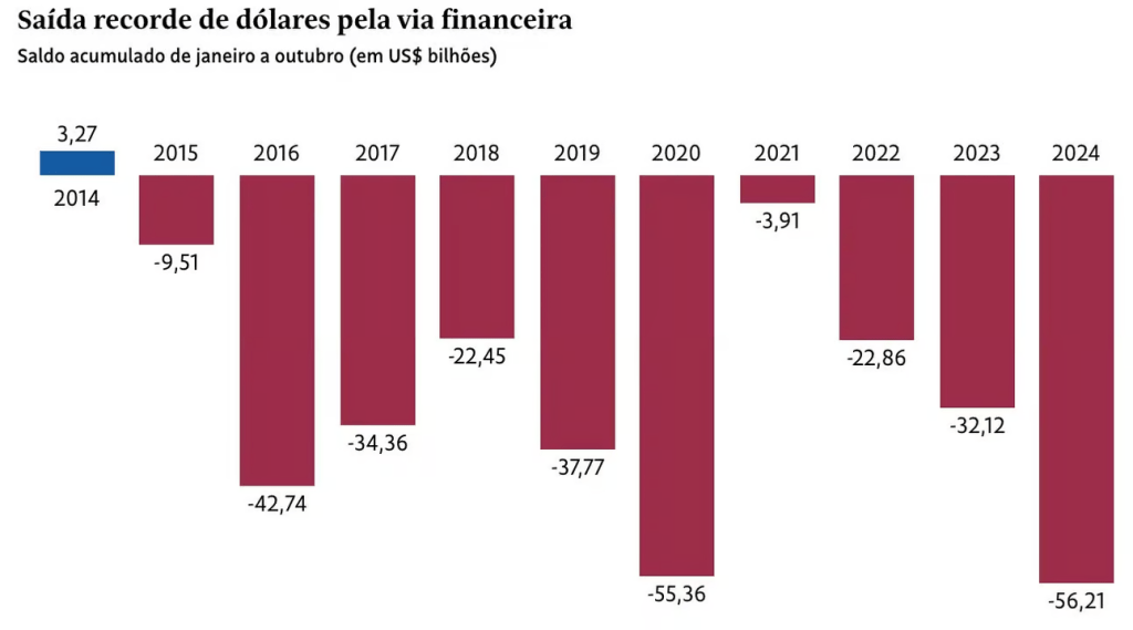 Como a saída de dólares no final do ano é algo comum — principalmente o envio de lucro para as matrizes estrangeiras —, o Brasil deve fechar 2024 com o maior volume de dólares saindo pela via financeira na história.