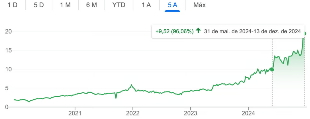 Para se ter uma ideia, o preço das ações dela já tinham subido 78% no ano passado, aproveitando o boom da demanda vinculada à AI. Agora, de junho para cá, as ações subiram mais 96%.